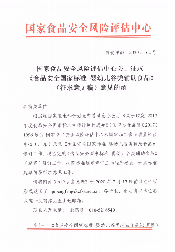 2020年7月10日,國(guó)家食品安全風(fēng)險(xiǎn)評(píng)估中心發(fā)布關(guān)于征求《食品安全國(guó)家標(biāo)準(zhǔn) 嬰幼兒谷類輔助食品(征求意見(jiàn)稿)》意見(jiàn)的函,該標(biāo)準(zhǔn)將代替GB 10769-2010《食品安全國(guó)家標(biāo)準(zhǔn)嬰幼兒谷類輔助食品》。
