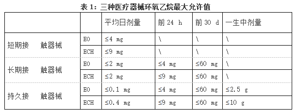 環(huán)氧乙烷是一種中樞神經(jīng)抑制劑,殘留量超標(biāo)會對人體健康造成危害??芍轮袠猩窠?jīng)系統(tǒng)、呼吸系統(tǒng)損害,是有毒、致癌物藥品。因此使用環(huán)氧乙烷消毒后的物品需對環(huán)氧乙烷殘留量進(jìn)行檢測達(dá)到標(biāo)準(zhǔn)的限量值。根據(jù)《GB/T16886.7-2015醫(yī)療器械生物學(xué)評價第7部分環(huán)氧乙烷滅菌殘留量》國家標(biāo)準(zhǔn),分為短期接觸、長期接觸、持久接觸三種。殘留限量值見表1。