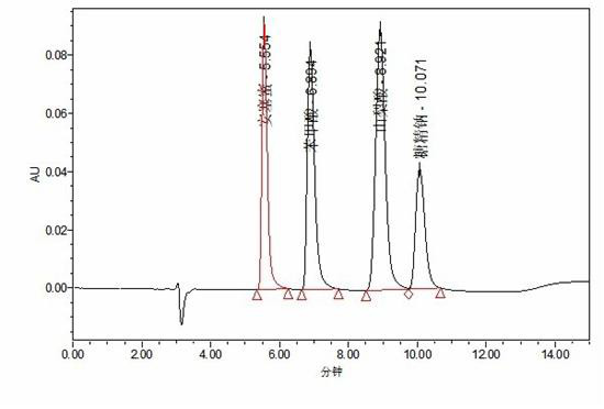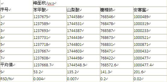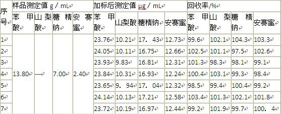 取濃度為苯甲酸、山梨酸、糖精鈉、安賽蜜濃度為 10.0ug/ml,平行測定 7 次。