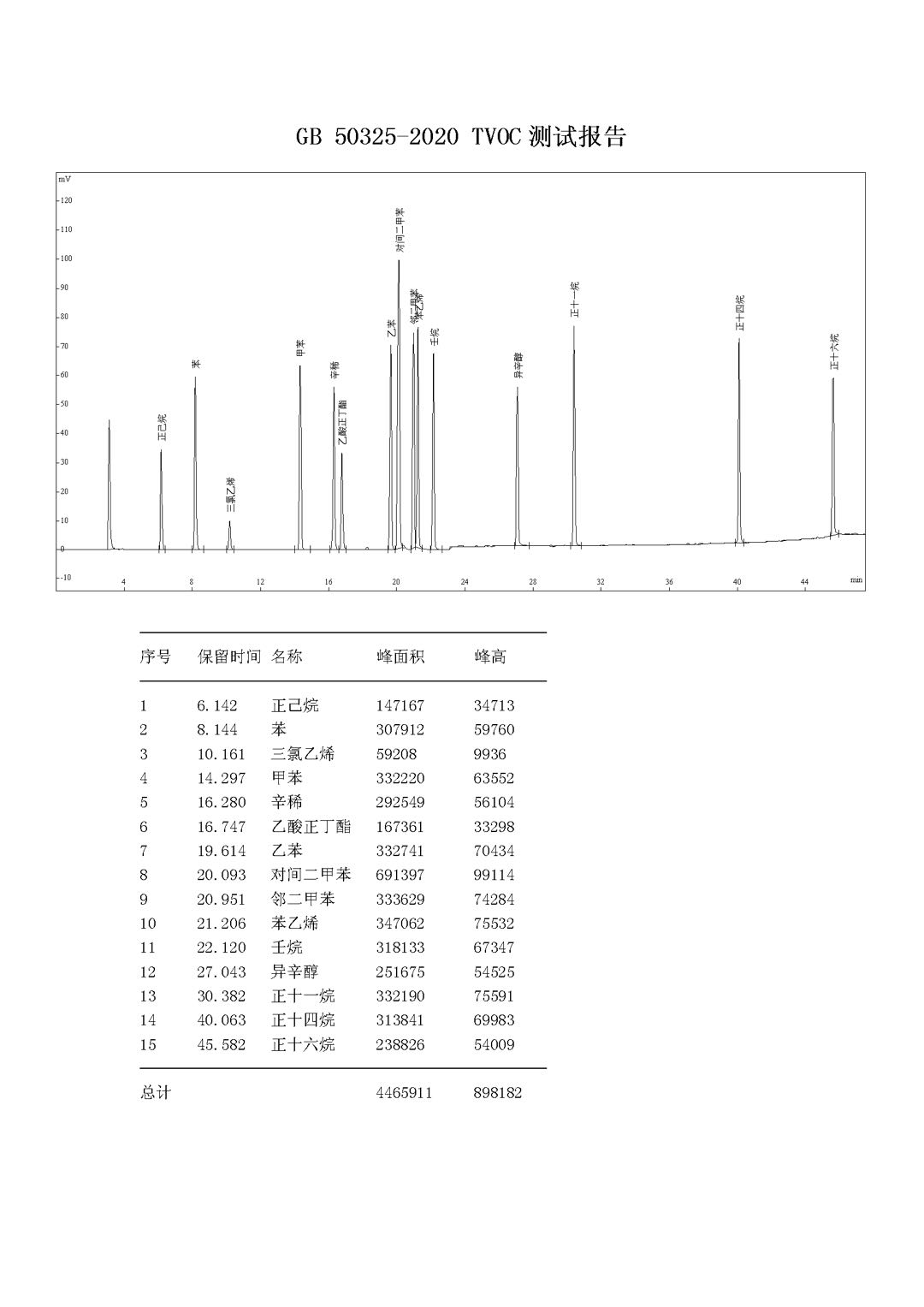 出峰順序:1正己烷?2 苯?3三氯乙烯 4甲苯?5辛烯?6乙酸丁酯?7乙苯?8對間二甲苯 9 鄰二甲苯 10苯乙烯 11壬烷 12異辛醇 13正十一烷 14 正十四烷 15正十六烷