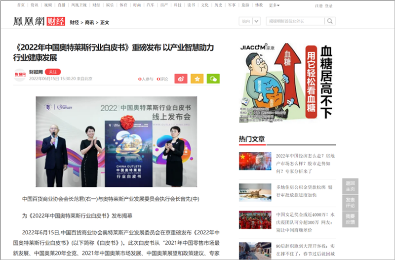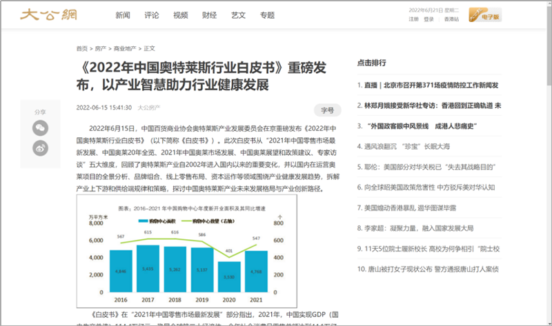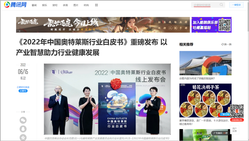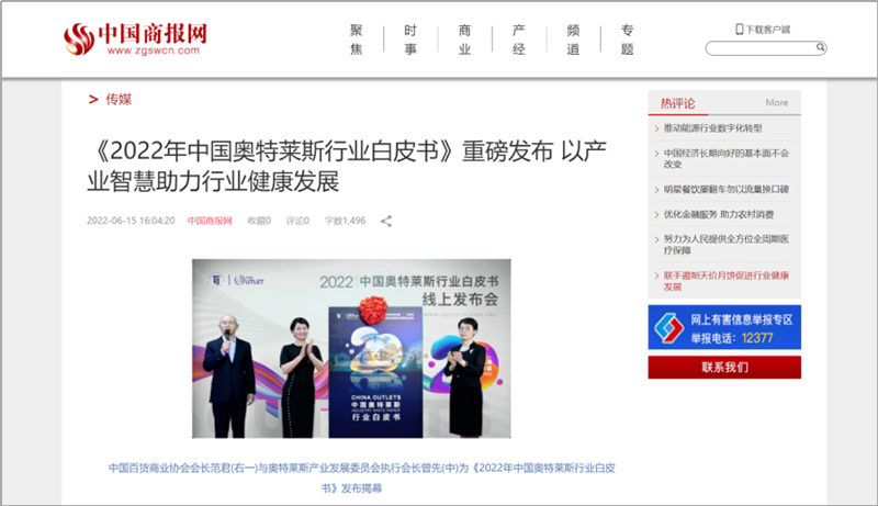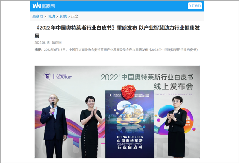 2022年6月15日,中國(guó)百貨商業(yè)協(xié)會(huì)奧特萊斯產(chǎn)業(yè)發(fā)展委員會(huì)線上直播發(fā)布《2022年中國(guó)奧特萊斯行業(yè)白皮書(shū)》。白皮書(shū)中“2021年中國(guó)零售市場(chǎng)最新發(fā)展、中國(guó)奧萊20年全覽、2021年中國(guó)奧萊市場(chǎng)發(fā)展、中國(guó)奧萊展望和政策建議、專(zhuān)家訪談”等內(nèi)容吸引政府領(lǐng)導(dǎo)、專(zhuān)業(yè)機(jī)構(gòu)、產(chǎn)業(yè)運(yùn)營(yíng)商、品牌商、服務(wù)商、媒體記者及眾多奧萊消費(fèi)者共計(jì)20余萬(wàn)人參會(huì),成為國(guó)內(nèi)奧萊行業(yè)年度一大焦點(diǎn)。