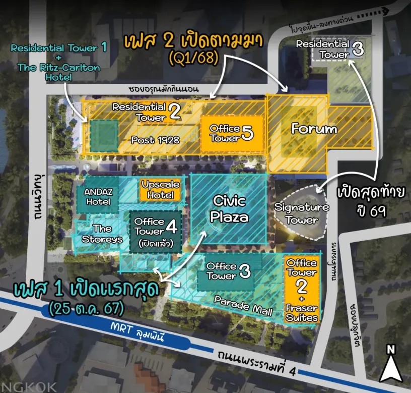 辦公樓方面,現(xiàn)階段3號塔、4號塔和5號塔已經(jīng)陸續(xù)投入使用,包括律師事務(wù)所Baker & McKenzie Ltd.、雅詩蘭黛集團(tuán)、寶馬集團(tuán)、KGI Securities、Menarini、LINE MAN Wongnai等跨國公司都已選擇將辦公地點(diǎn)遷至于此。