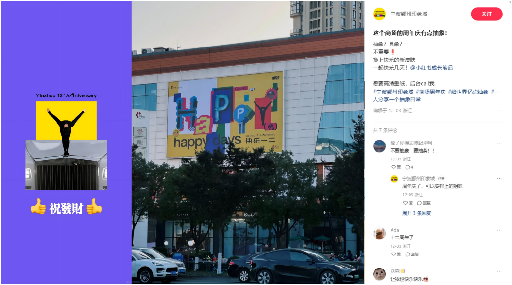 對于多數(shù)購物中心而言,因其目標客群相對寬泛,通過抽象文化形成“群體認同感”的難度比品牌方更高。所以,購物中心的抽象式營銷,既要出圈,又不能過于小眾。購物中心官方發(fā)布的一條小紅書筆記能讓用戶一眼看懂,并愿意發(fā)聲回應,如此才是有效“抽象”。