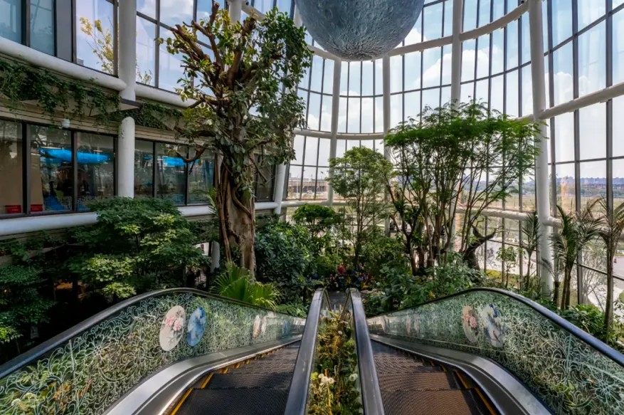 以“一日微度假勝地”為定位的上海南翔印象城MEGA,不僅融合了多元業(yè)態(tài),還巧妙地融入了植物園等自然生態(tài)元素。在建筑設(shè)計(jì)上,其外立面以“梯田山丘”為靈感,打造出上海罕見的退臺(tái)花園;在商場(chǎng)內(nèi)部,創(chuàng)造性地引入了森林、濕地等自然景觀,構(gòu)筑了一座占地約600平方米、高達(dá)5層、擁有200多種國(guó)內(nèi)外植物的跨層生態(tài)植物園。